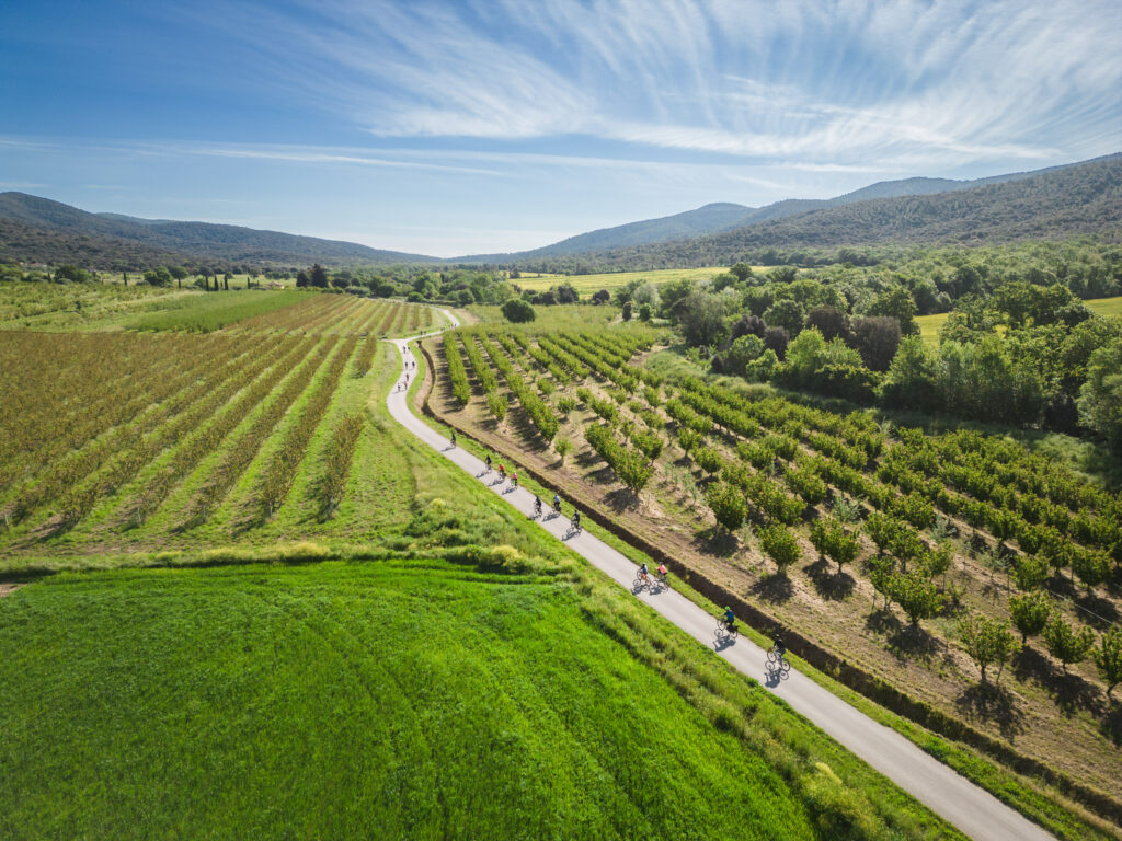 The reason is simple: here, gravel meets a special setting made of pine forests overlooking the sea, white roads alternating with coastal dirt tracks, gentle climbs through vineyards and olive groves, and sudden views opening onto the Tuscan horizon. It is a route that requires strong legs, but also invites riders to look around, leaving space for adventure, landscape, and the sheer pleasure of the ride. No competitive pressure, no rankings to chase, just the joy of crossing the wildest side of Maremma and discovering it from the saddle, kilometre after kilometre.